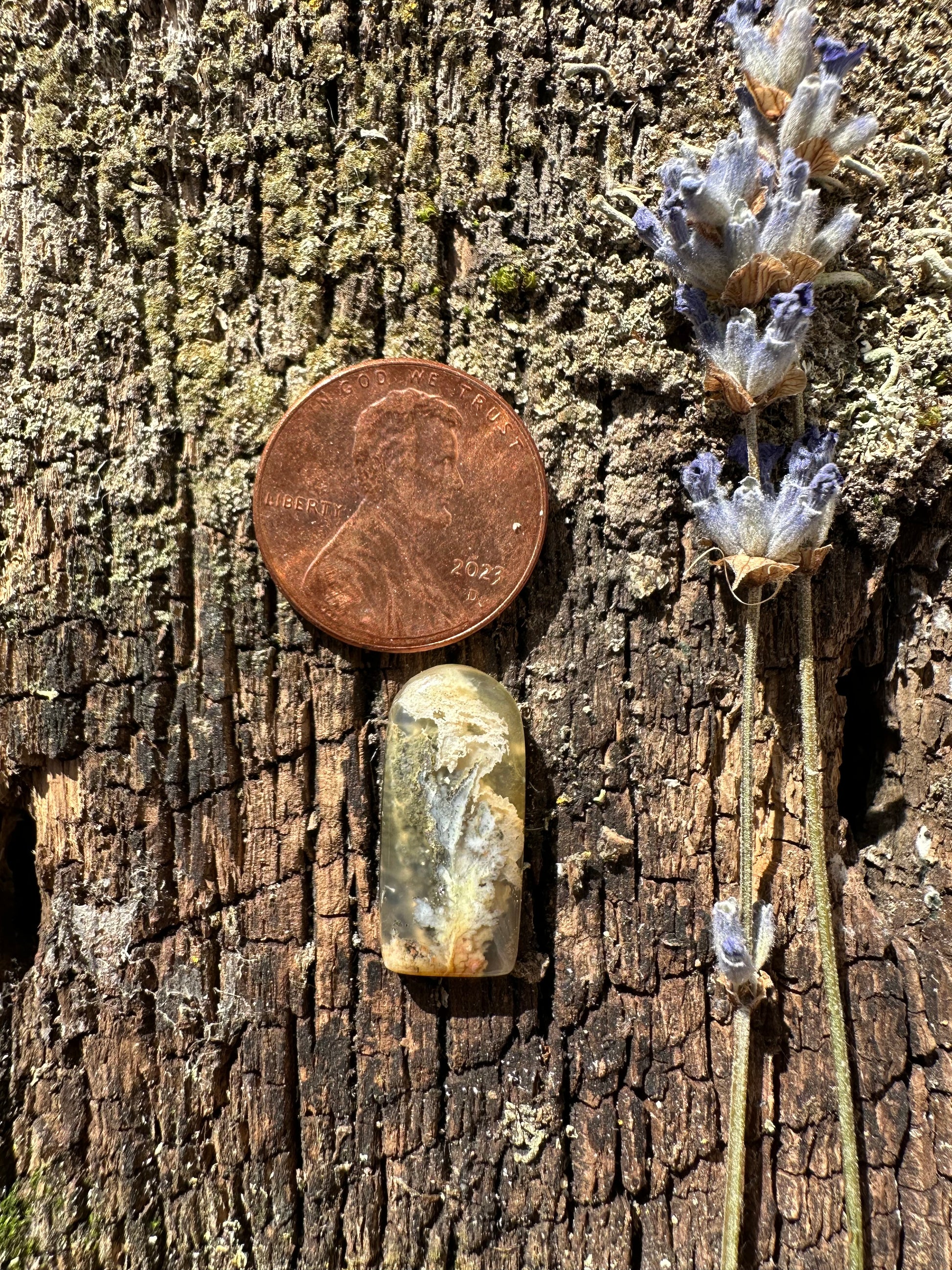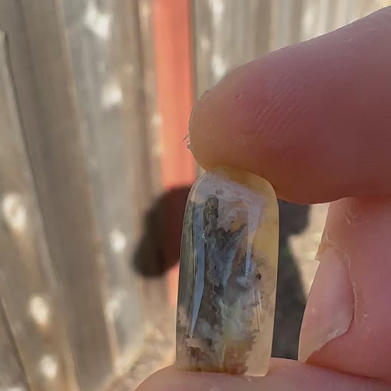 This material comes from Eastern Oregon and is known for its multi-colored plumes. However, if you’re lucky you’ll have some shiny metallic marcasite plumes like this has! Metallic streaks are seen in video. Multiple photos taken in outdoor direct sunlight and indoor indirect sunlight to show variation in stone color and patterns. Stone back is polished and beveled for versatile and easy setting.